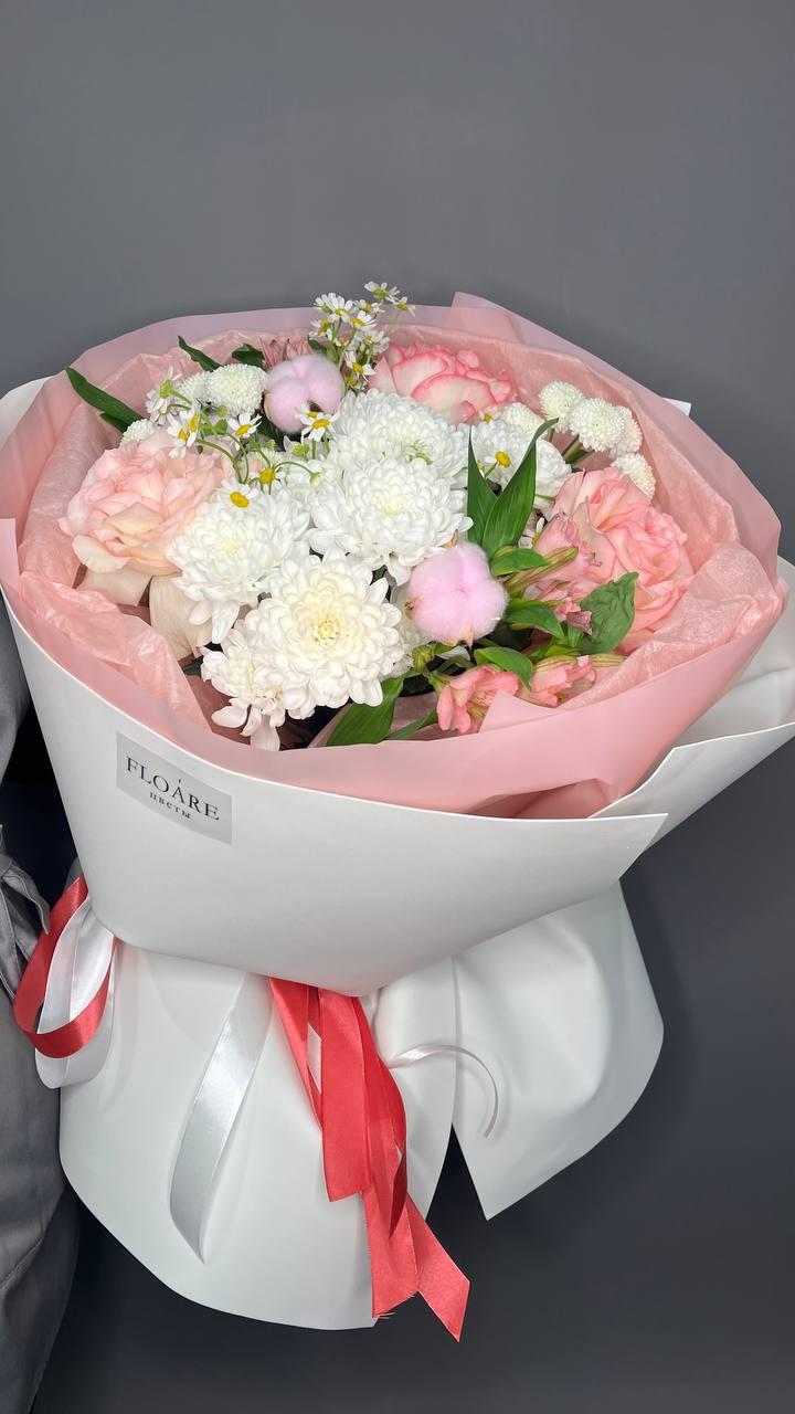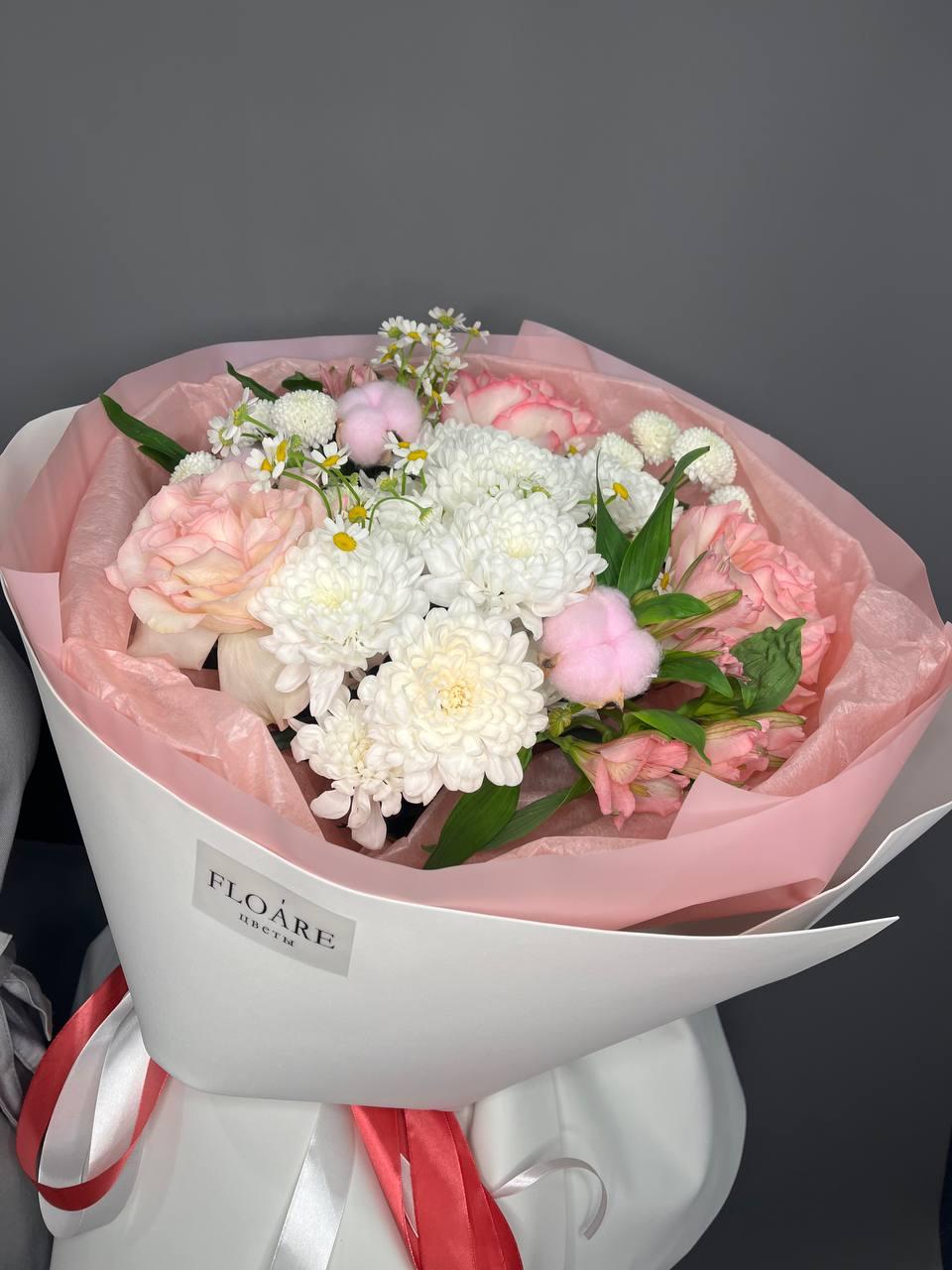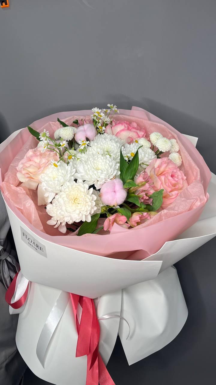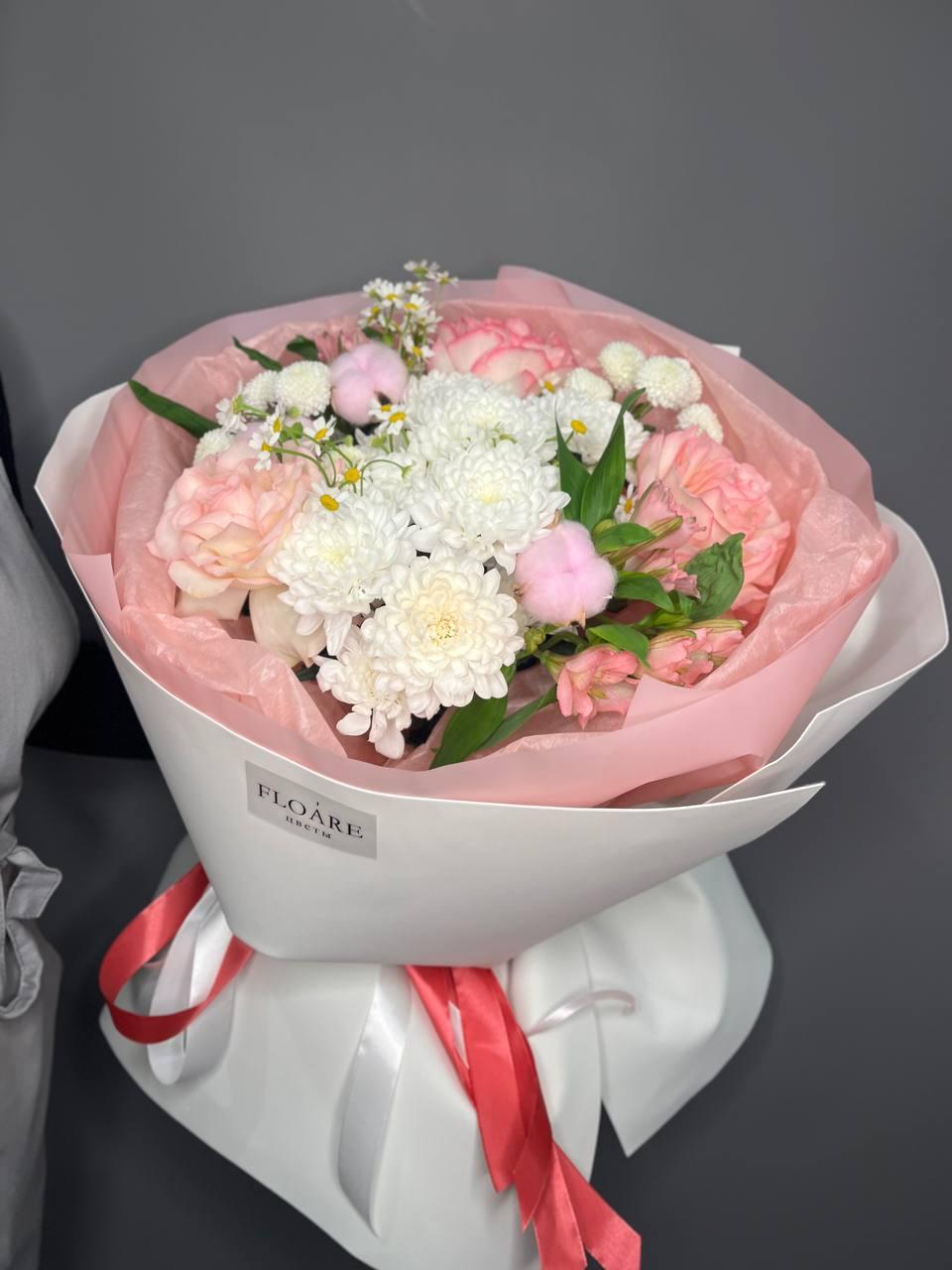 "Весенний рассвет" — это нежное сочетание розовых и белых цветов, символизирующих пробуждение природы. Букет упакован в белую бумагу с надписью "FLOARE", что придает ему элегантный вид. Идеальный подарок для выражения нежных чувств и восхищения.